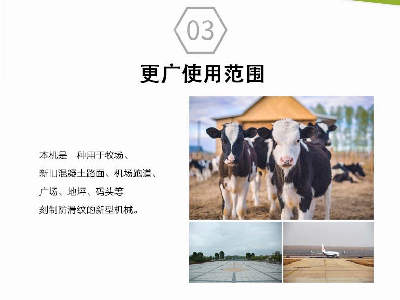 牧場防滑刻紋機(jī)為我公司新研制的一款特制的新型產(chǎn)品,該款刻槽機(jī)主要適用于養(yǎng)殖場、奶牛場、牛棚、牧業(yè)等各類混凝土地面、跑道、廣場、室內(nèi)刻制防滑紋(兼散水紋)的一款新型機(jī)器。紋理排列有序、槽紋表面清晰美觀、操作便捷,是養(yǎng)殖業(yè)針對地面防滑的一款新型機(jī)械。
