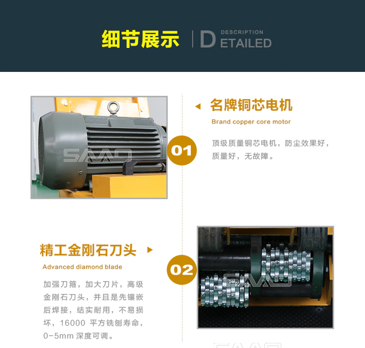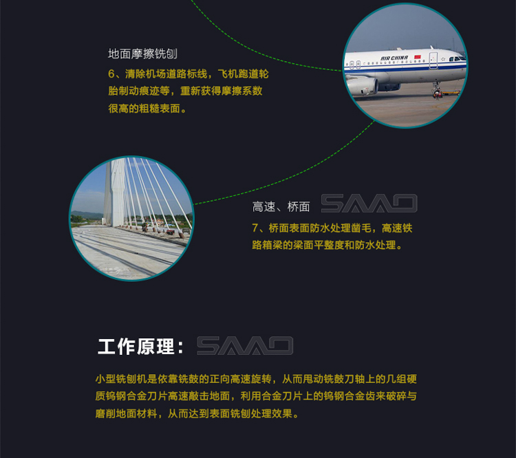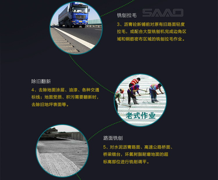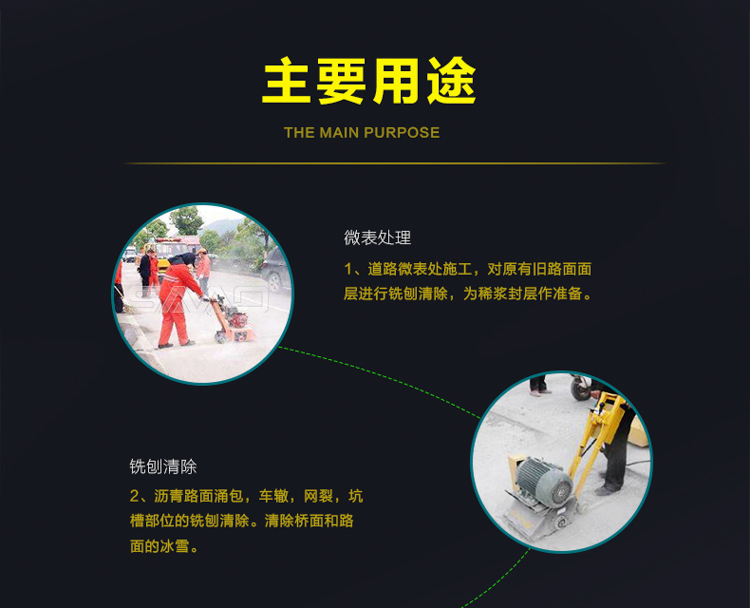 用于橋面鋪設(shè)瀝青或車間舊的混凝土地面重新攤鋪混凝土之前,清除水泥浮漿以及鏟平拉毛,也用于清除建筑施工中遺留的堅(jiān)硬灰渣。
