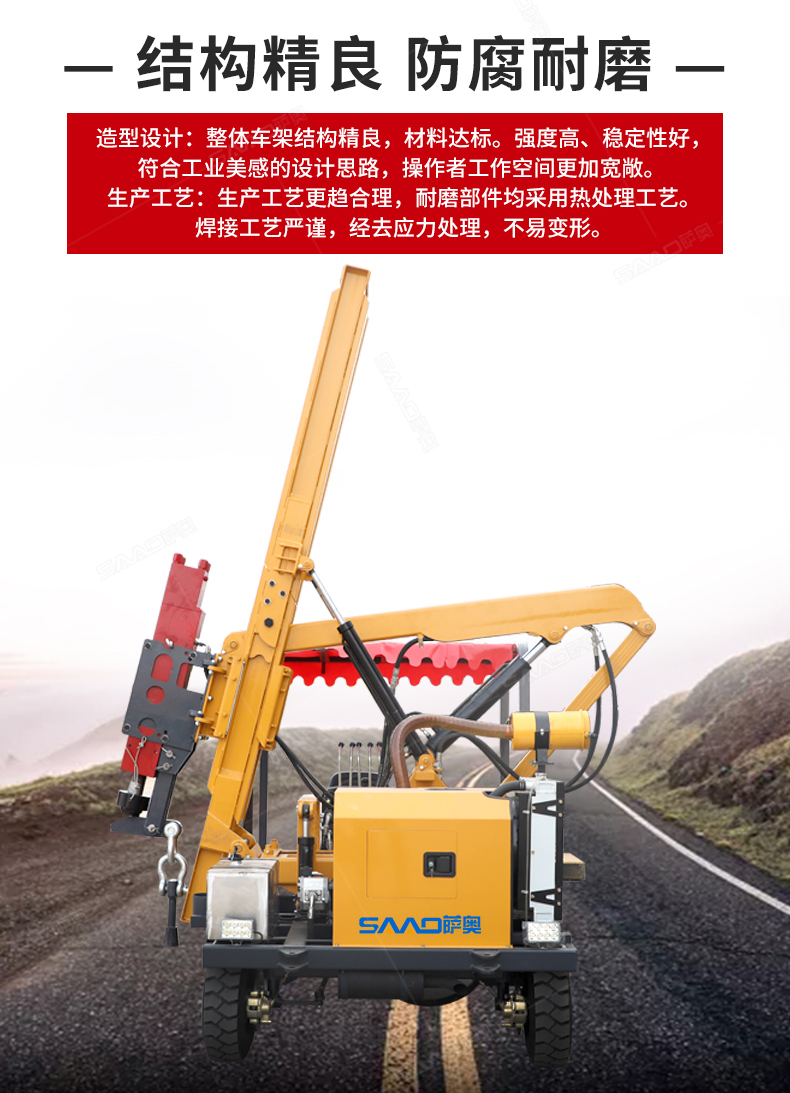 小四輪打樁機(jī)是護(hù)欄打拔鉆一體機(jī)的同類(lèi)產(chǎn)品,也是用于公路波形護(hù)欄的安裝。該機(jī)采用柴油動(dòng)力,全液壓機(jī)械傳動(dòng),具有行駛輕便、打樁精度高、經(jīng)久耐用、節(jié)能環(huán)保等特點(diǎn),特別適用于公路護(hù)欄安裝、維修和搶修的野外工程施工。
