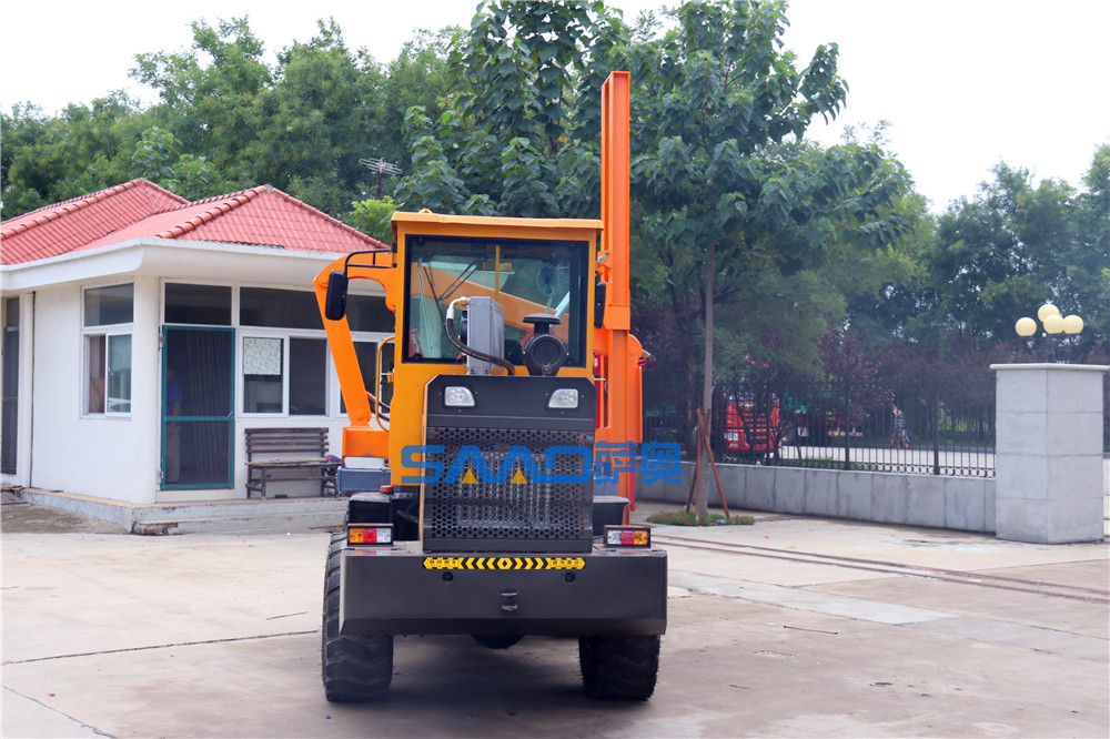 薩奧裝載機(jī)式護(hù)欄打樁機(jī)是一種新型,高效,自行式的先進(jìn)公路設(shè)備及補(bǔ)樁設(shè)備。該機(jī)打樁深1600mm,每天大約打樁250-300個(gè),行走速度3-5Km/h,該樁機(jī)可換機(jī)頭,作為潛孔鉆機(jī)使用。該機(jī)采用液力機(jī)械傳動(dòng),集打樁、拔樁、鉆孔功能于一身,具有作業(yè)效率高、省時(shí)省工、性能可靠、拔樁效率高、使用壽命長、移位方便等特點(diǎn)。公路打樁機(jī)結(jié)構(gòu)性能推進(jìn)為液壓油缸推進(jìn),在該移位時(shí)移動(dòng)要注意安全,樁的垂直度要掌握好,可以通過拉緊器調(diào)整滑道。