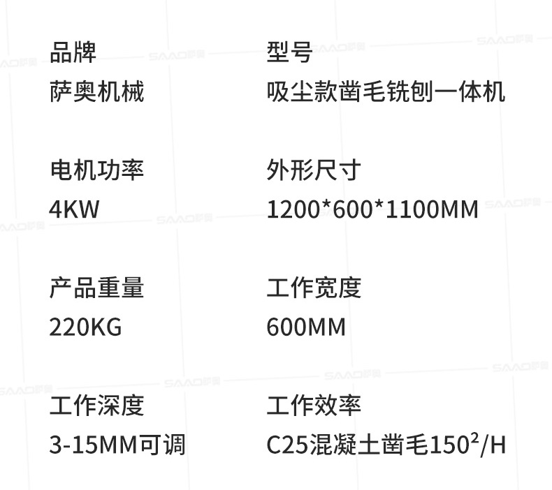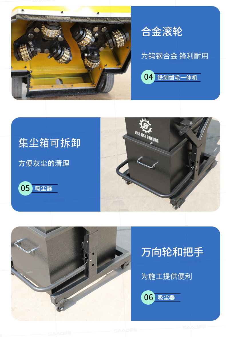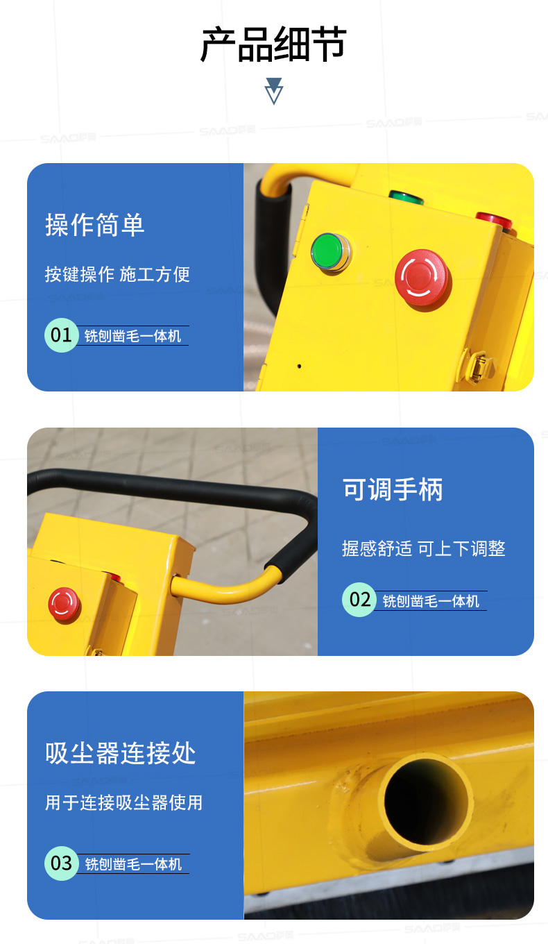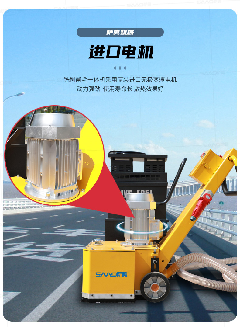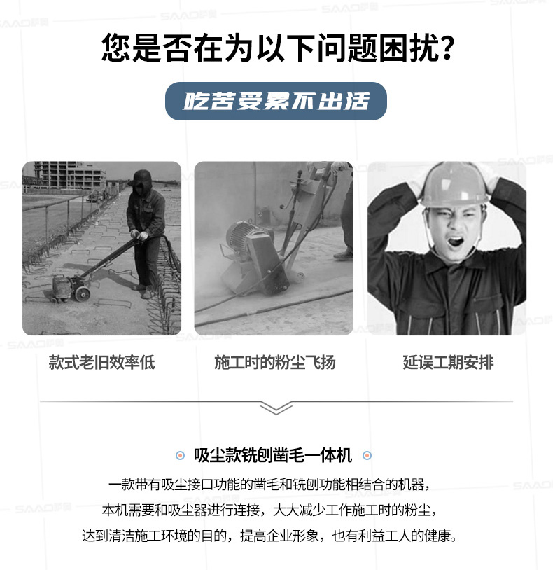 此款設(shè)備同時具有銑刨和鑿毛功能,并且?guī)в形鼔m接口,與吸塵器相連接,解決銑刨鑿毛過程中的粉塵問題,減少粉塵對環(huán)境以及人體的危害,達(dá)到清潔施工環(huán)境的目的,提高企業(yè)形象