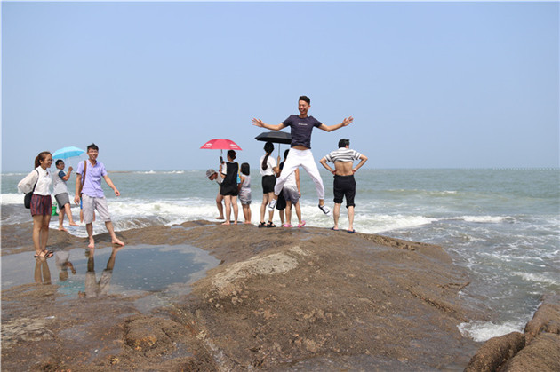 在海礁石上,迎著海浪沖擊,面對大海吶喊,進一步的與大海交流。激動的大家一蹦三尺高。
