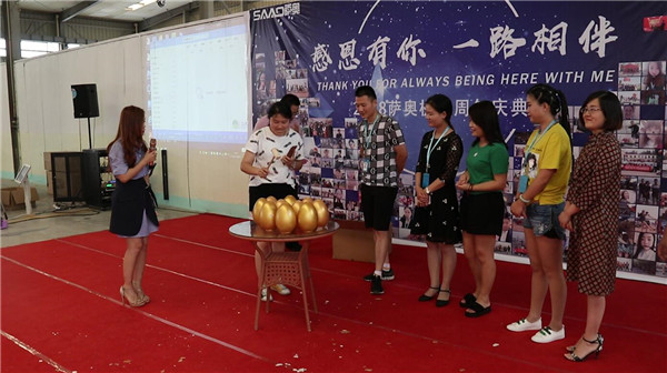 很多時(shí)候都不得不感慨一句,薩奧真的是人才濟(jì)濟(jì)。既然是周年典慶,那么才藝表演自然少不了。在一輪又一輪的才藝表演過(guò)后,接下來(lái)就展開了砸金蛋的環(huán)節(jié)。桌上放著10個(gè)金蛋,每個(gè)金蛋里都放了數(shù)額不同的人民幣,選出10個(gè)表現(xiàn)好的員工,依次砸金蛋,砸哪個(gè)金蛋,哪個(gè)金蛋里的錢就屬于自己。是不是很好玩啊?