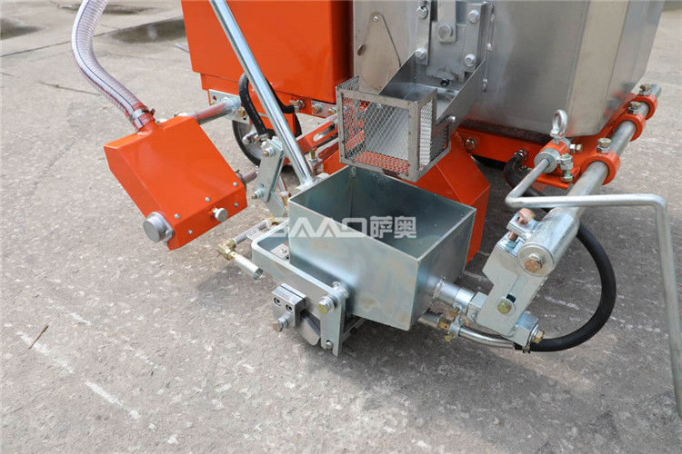 熱熔型標(biāo)線涂料在常溫下是固體粉末狀,施工時(shí),將涂料投入熔融釜中,邊熔化邊攪拌,待熔化呈熔融流動(dòng)狀態(tài)后,放入劃線車的保溫熔融料斗中。按設(shè)計(jì)圖標(biāo)明的涂敷位置上用下涂劑機(jī)涂敷底漆。待下涂劑干了之后,方能涂敷標(biāo)線涂料。開始劃線時(shí),應(yīng)把劃線斗放在路面上,由于劃線斗與地面間有一定的間隙,當(dāng)劃線車前行時(shí),靠自動(dòng)流淌而刮抹出一條整齊的標(biāo)線。
