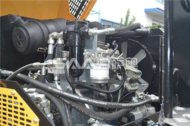 潤滑油缸座與鉸接架時需轉(zhuǎn)動方向盤以暴露全部油嘴,此時操作人員絕對不許靠近鉸接架。只有待停熄發(fā)動機后并加以制動,才可以近前加油。