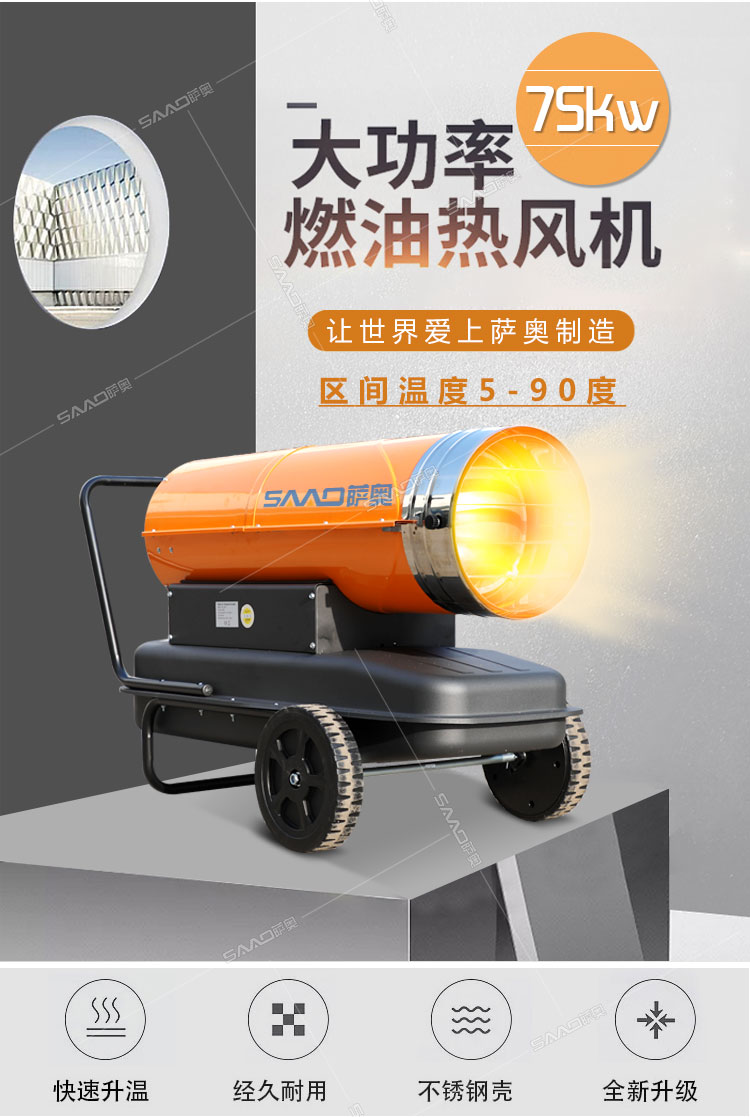 燃油暖風(fēng)機(jī)可控制區(qū)間溫度為5-90度,風(fēng)量更大,升溫更快,在木材的烘干等方面有巨大的功效,非常適合大面積的工業(yè)場所使用。