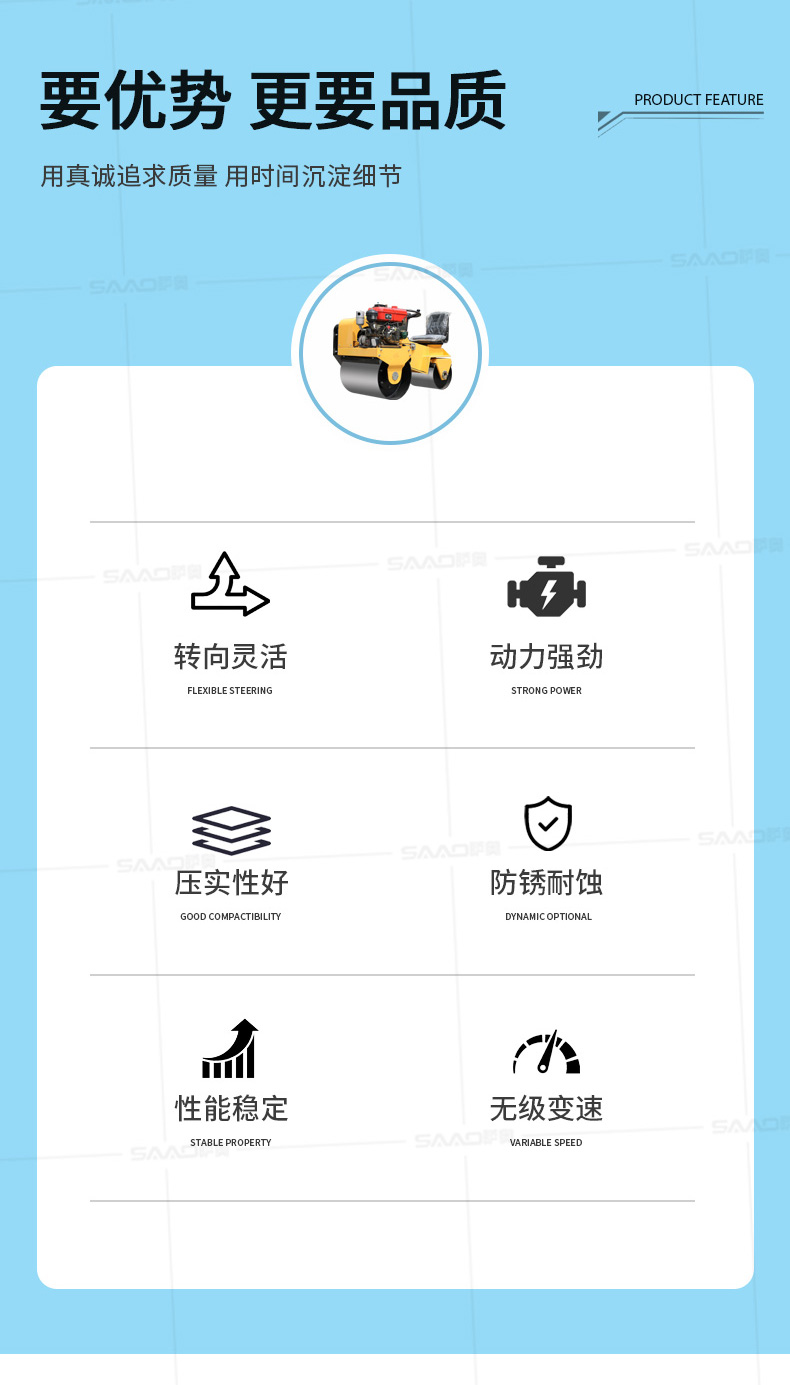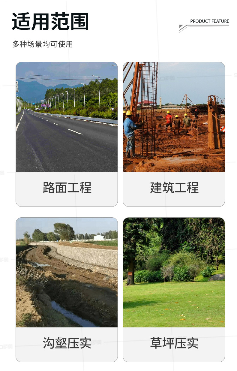 用于壓實(shí)瀝青表面,壓實(shí)礫石、沙土等工程基礎(chǔ),碾壓草坪,作業(yè)半徑小,可在狹小的區(qū)域內(nèi)工作;國(guó)內(nèi)名優(yōu)柴油機(jī),名牌品質(zhì)保證,性能優(yōu)越,啟動(dòng)容易;